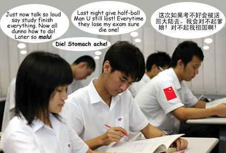 Die lah all dunno … if this simple one cannot do, then later those difficult ones how? … must make sure I get this one right first … $%&# still stuck! … why those I study never come out? … die lah! … ‘Cher will hate me! … Miss Loi will hate me! … I have failed my entire ancestral line! … ok don’t panic I can do this … how come stare at this question for 15 mins still cannot do?!