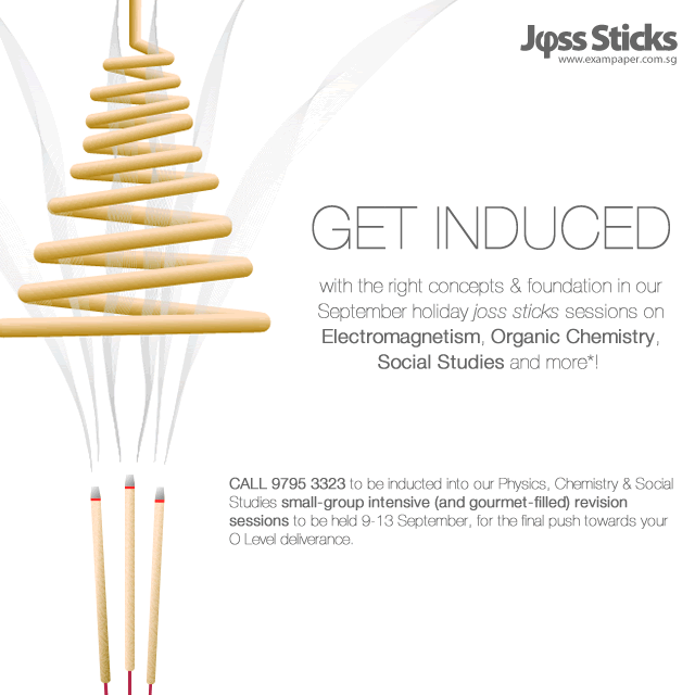After this, head quickly to The Temple for its *September Holiday intensive joss sticks sessions for Organic Chemistry, Electricity & Electromagnetism – the very topics you are having trouble with as they were not covered during their June Holiday joss sticks sessions (due to a lack of time).