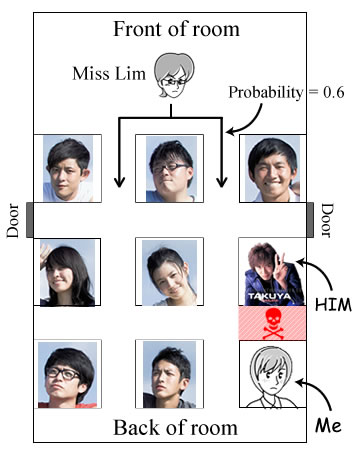 The diagram shows the seating arrangement during the math test. Miss Lim invigilates by patrolling VERY quickly in a general direction from the front to the back of the room.